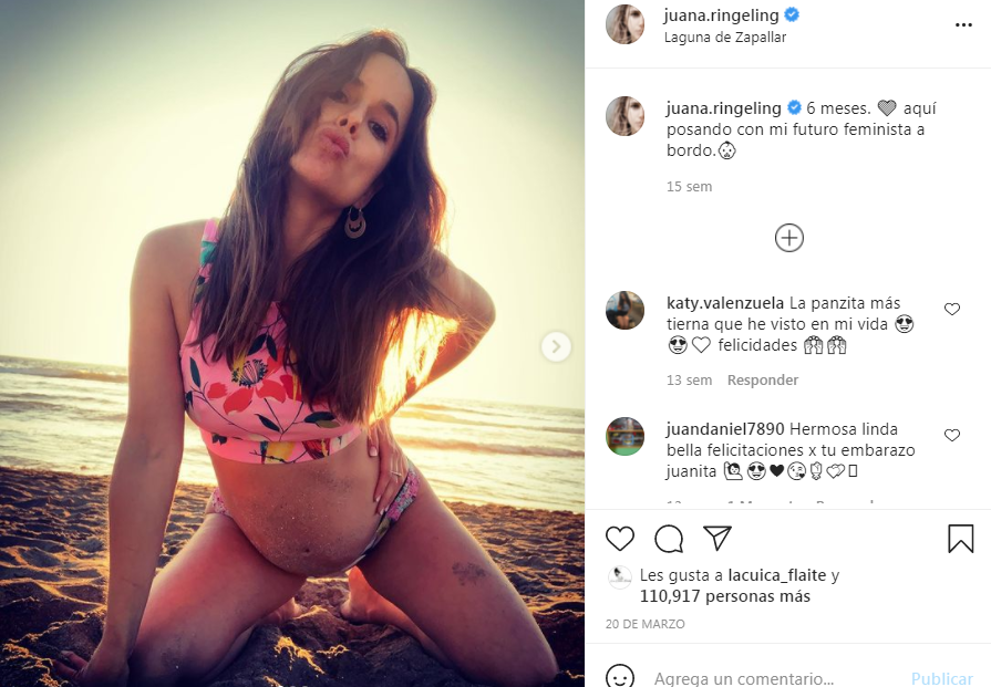 Esto fue a través de su Instagram, ahí, la joven subió una fotografía de ella mostrando su pancita con el mensaje «6 meses. Aquí posando con mi futuro feminista a bordo».
