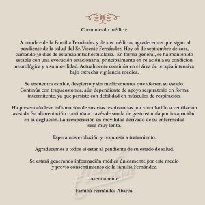 Sin embargo, el día de ayer se cumplió un mes desde que Vicente fue internado y la familia del cantante a través de un comunicado emitido en Instagram; a parte de agradecer por el apoyo y preocupación que existido en torno a su estado de salud, aprovechó de informar