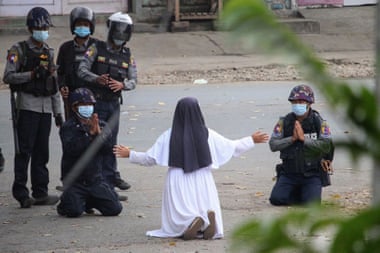 8 de marzo, tras una serie de protestas en contra del gobierno de Myanmar, la policía realiza una matanza en contra de los protestantes. Es en ese contexto, donde se le saca una foto a una monja se pone a rezar en medio de los enfrentamientos.