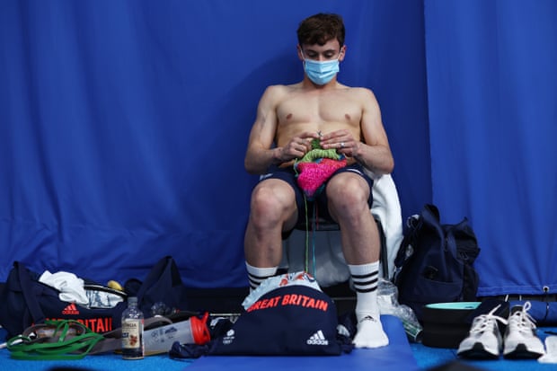7 de agosto, el deportista olímpico Tom Daley está tejiendo antes de su prueba por competir por el oro en los Juegos Olímpicos de Tokyo.