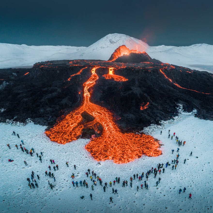 9 de abril, tras la erupción de un volcán en Islandia, varios turistas se juntaron alrededor del cráter para observar este suceso. Posteriormente, se formaría un segundo cráter en donde están las personas.