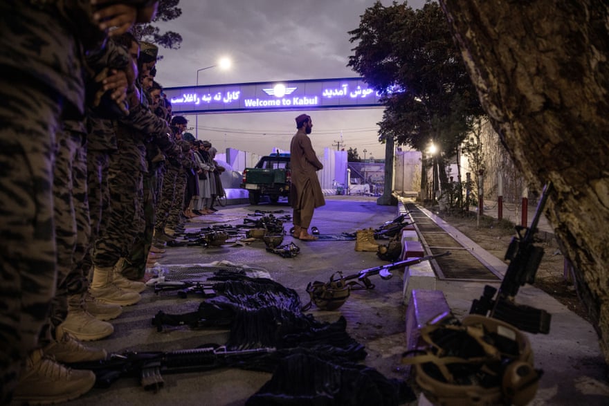 28 de agosto, tras dos semanas en una guerra civil. Los combatientes talibanes deben proteger el aeropuerto de la ciudad para evitar que entre o salga gente, en ese contexto son fotografiados rezando antes de comenzar la jornada.