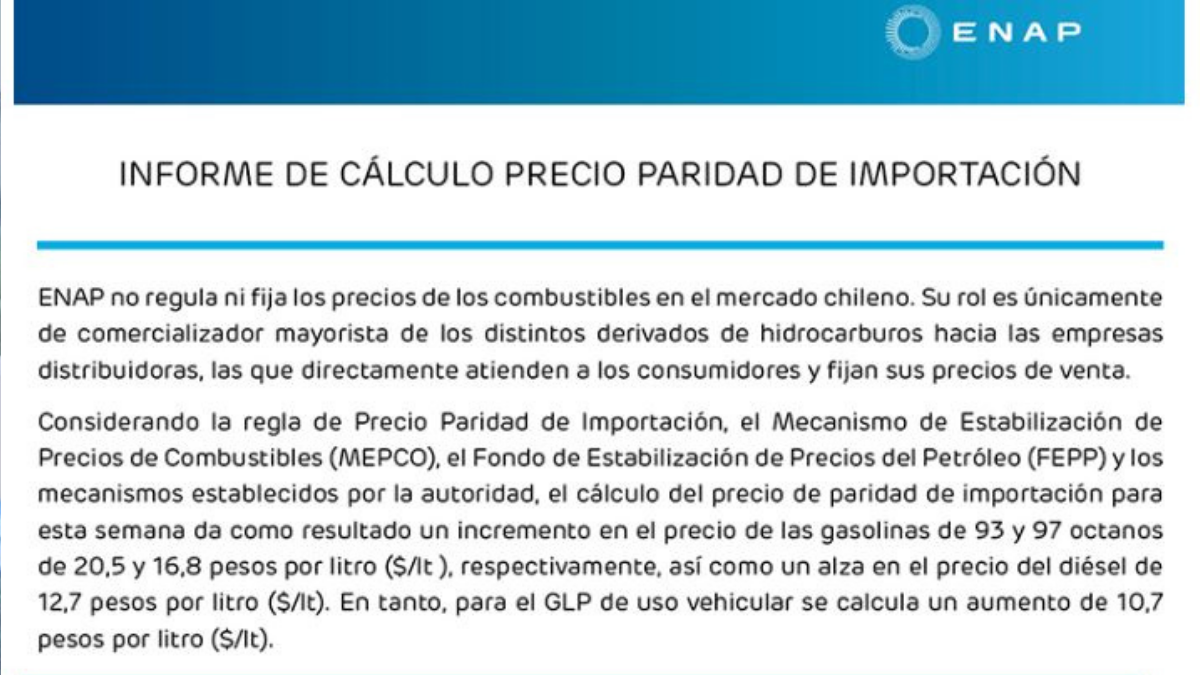 Finalmente, tras esta alza, la gasolina de 93 octanos se incrementará en $20,5 pesos el litro y la bencina de 97 subirá $16,8 pesos por litro. Mientras que el diésel subirá $12,7 pesos y el GLP tendrá un incremento de $10,7