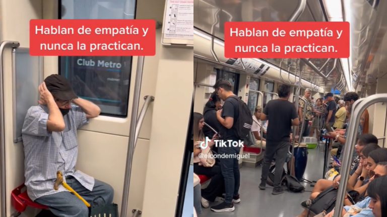 Se trata de un registro en donde se ve cómo un adulto mayor se tapa los oídos por el ruido que genera una banda musical dentro del vagón.