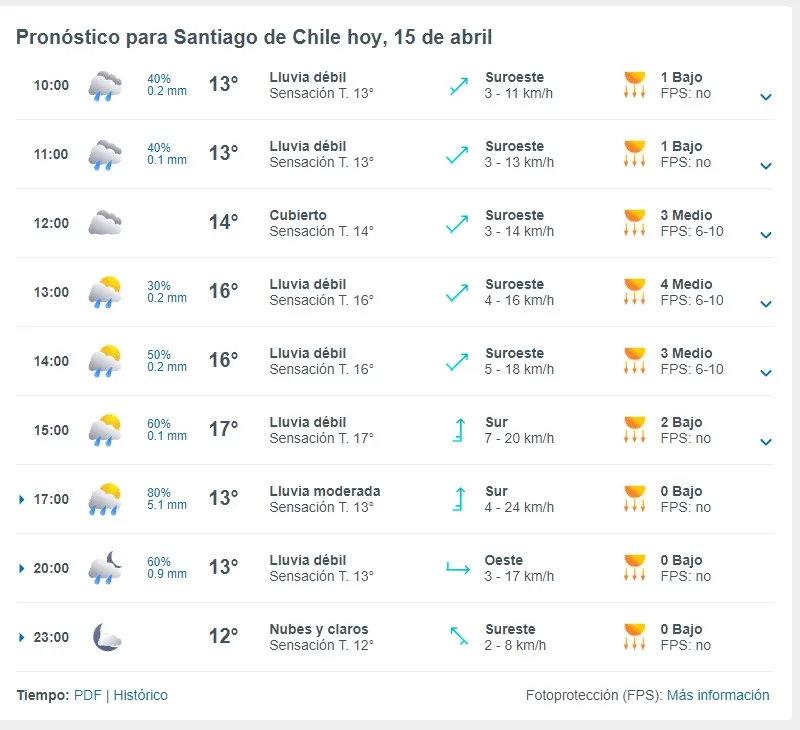 Según la entidad meteorológica Metoered, reveló en su pronóstico del tiempo que las precipitaciones tendrán cierta intermitencia. Es decir, que se registrarán en varios momentos del día, pero serán de carácter leve. Por lo mismo a continuación te mostramos en detalle hasta qué hora lloverá en Santiago.