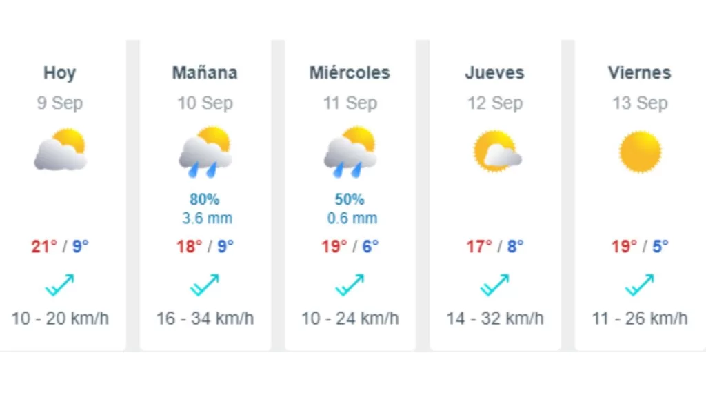 - Martes 10 de septiembre: Mínima de 9° C, máxima de 18 grados.