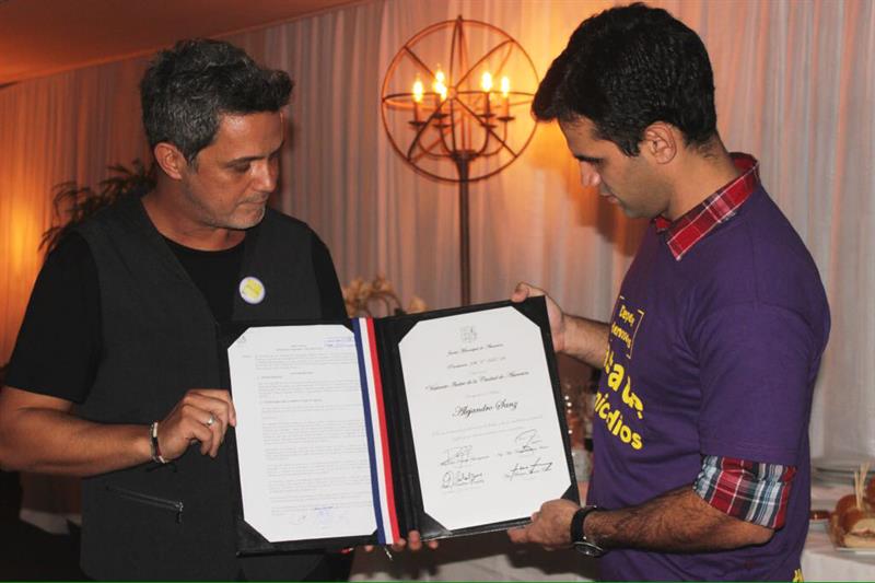 Alejandro Sanz recibió una placa que lo reconoce como visitante ilustre de la cuidad de Asunción, Paraguay.
