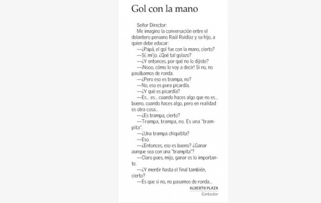 Alberto Plaza no quiso quedar ajeno a esta polémica por lo que mandó una carta titulada “Gol con la mano” al diario El Mercurio, recalcando que se imagina una conversación entre el autor del gol y su hijo “a quien debe educar”.