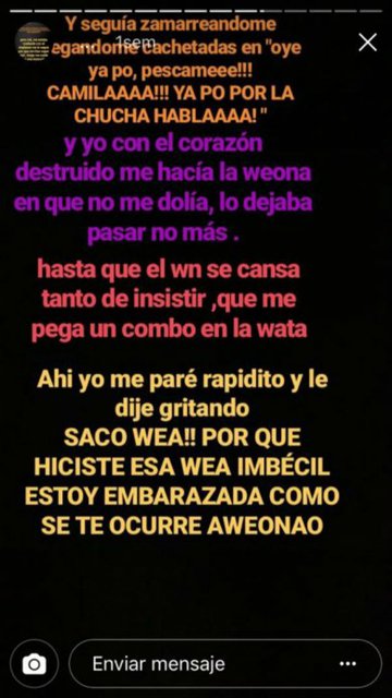 Camila asegura que el actor la obligó a tener sexo y que actualmente no se hace cargo de sus hijas. “Asqueroso de mierda, me importa una raja tu pega y lo que te da de comer un asco (sic)”, decía una publicación que luego fue borrada y que fue la que derivó que posteriormente relatara los casos de violencia.