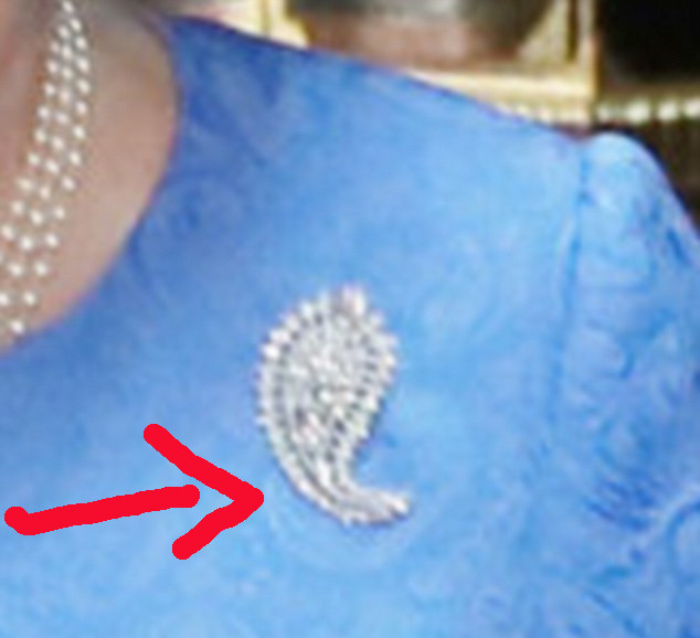 Esta vez se trata de un particular accesorio que utilizó la reina Isabel II durante esta visita. Una usuaria de Twitter, @SamuraiKnitter, notó que hasta la propia monarca no estaba muy contenta con esta reunión, ya que llevó un broche que le regaló Barack y Michelle Obama, cuando la visitaron en 2011.