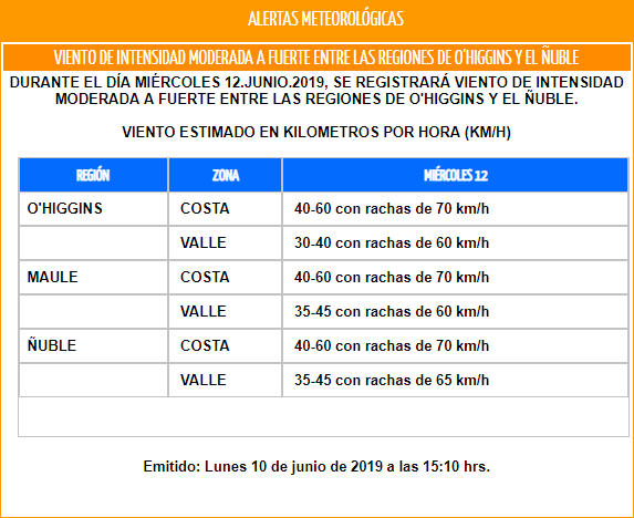 Además, la ONEMI declaró Alerta Temprana Preventiva para la región de Ñuble. Esto debido a las condiciones de riesgo y las respectivas vulnerabilidades asociadas a la amenaza de los fuertes vientos.