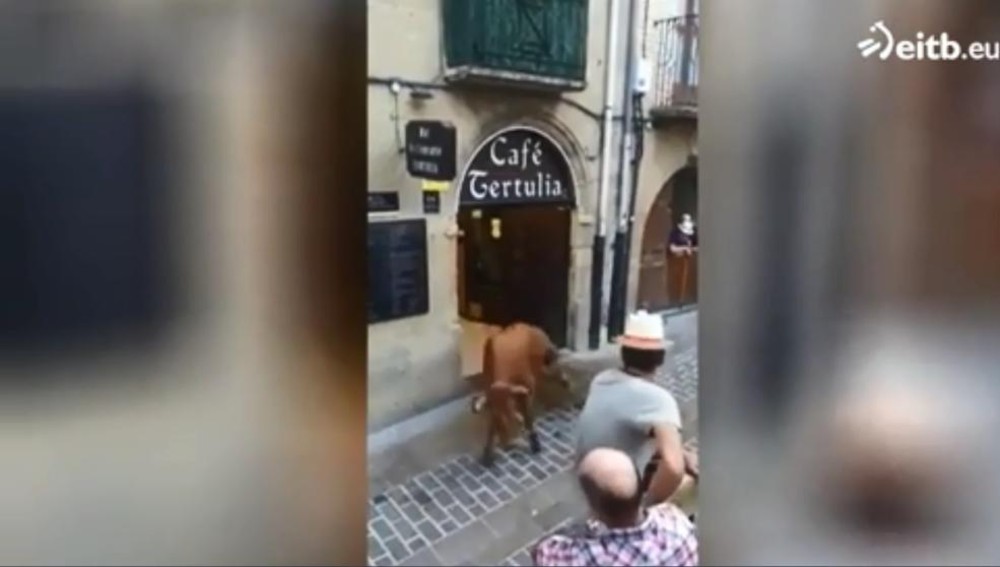 Los hechos ocurrieron el martes, después de que el animal, llamada «Milana», se escapase del recorrido en las fiestas de San Juan y San Pedro. En las imágenes difundidas por el canal Euskal Irrati Telebista y que fue compartido por La Vanguardia, se puede ver como el animal sale por la puerta del bar, donde un hombre intenta captar su atención para que abandone el establecimiento.