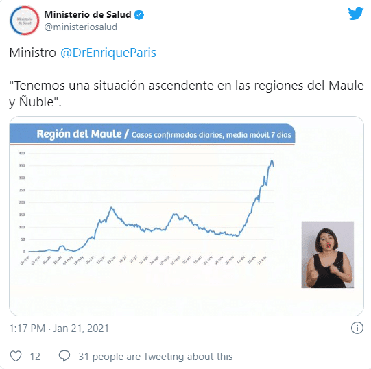 Al mismo tiempo, advirtió que mientras en la región Metropolitana los gráficos muestran una tendencia a mantenerse estables, hay preocupación por otras regiones como Maule y Ñuble. En la primera, «se observa una curva muy ascendente», dijo el ministro, lo que justifica la decisión de que Talca entre en cuarentena.