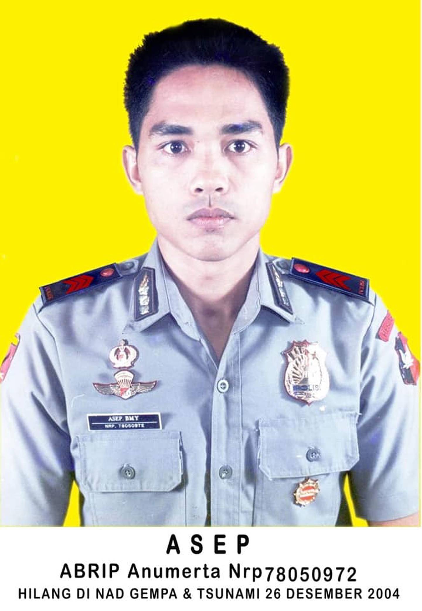 Hasta el día de hoy, entre todos los muertos se contabilizaba a un policía indonesio llamado Abrip Asep, quien estaba de turno esa noche en la provincia de Aceh. El hombre fue arrastrado por el tsunami que se generó en el área luego del movimiento telúrico.
