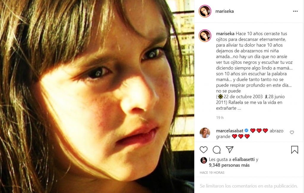 «Son 10 años sin escuchar la palabra mamá… y duele tanto tanto, no se puede respirar profundo en este día… no se puede. (🔆22 de octubre 2003 🎗28 junio 2011) Rafaela se me va la vida en extrañarte«, finalizó la diputada.