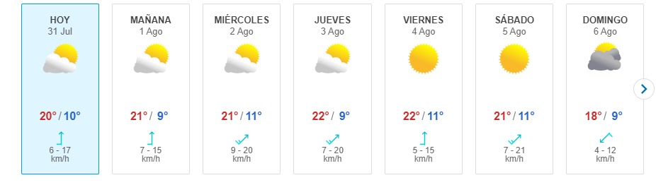 Bajo ese contexto, mañana 1 de agosto la temperatura tendrá una mínima de 9 grados y una máxima de 21°C. En cambio, pasado mañana, es decir el miércoles 2 de agosto, el tiempo será similar al día anterior, la máxima llegará a los 21 grados. Mientras, la mínima será de 11°C.