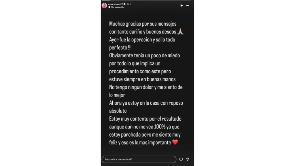 «Obviamente, tenía un poco de miedo por todo lo que implica un procedimiento como este, pero estuve siempre en buenas manos. No tengo ningún dolor y me siento de lo mejor, ahora estoy en casa con reposo absoluto», agregó.