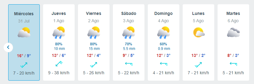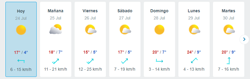 - Miércoles 24 de julio: Mínima de 4° C, máxima de 17 grados.