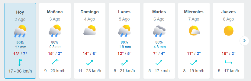 - Viernes 2 de agosto: Mínima de 7° C, máxima de 13 grados. (precipitaciones)