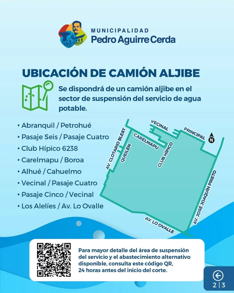 Según reveló la municipalidad de Pedro Aguirre Cerda, a través de redes sociales, «se han dispuesto camiones, aljibe y estanques de agua potable en los sectores afectados por el corte». Estos estarán ubicados por las calles Abranquil, Petrohué, Pasaje Seis, Pasaje Cuatro, Club Hipico 6238, Carelmapu, Boroa, Alhue, Cahuelmo, Vecinal, Pasaje Cuatro, Pasaje Cinco,, Los Alelíes y Av. Lo Ovalle. A continuación te dejamos el mapa entregado por el organismo mencionado.
