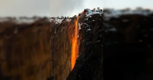 Se trata de una "cascada de fuego" que cae en medio de una montaña nevada, y que en realidad es un efecto óptico y no de la lava de un volcán.
